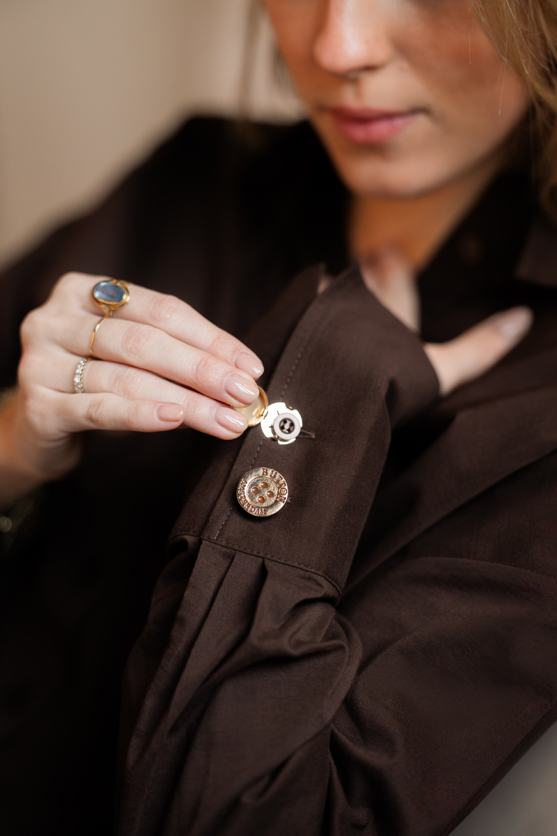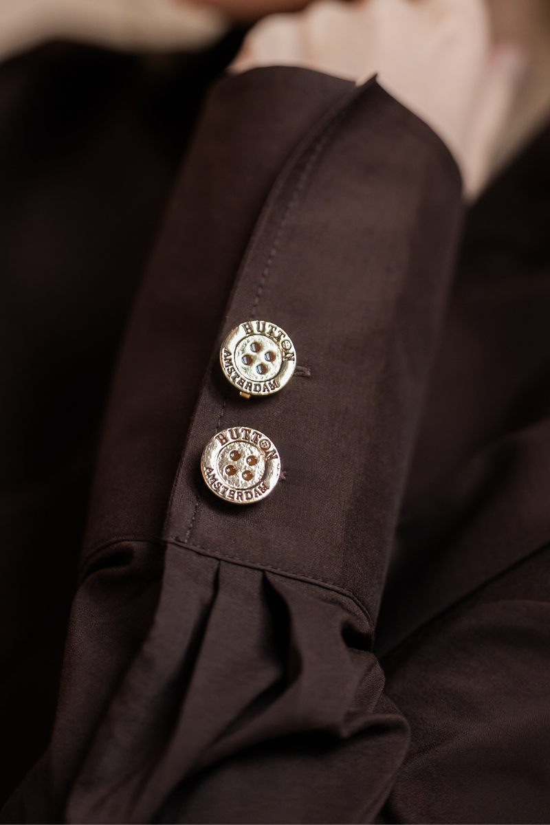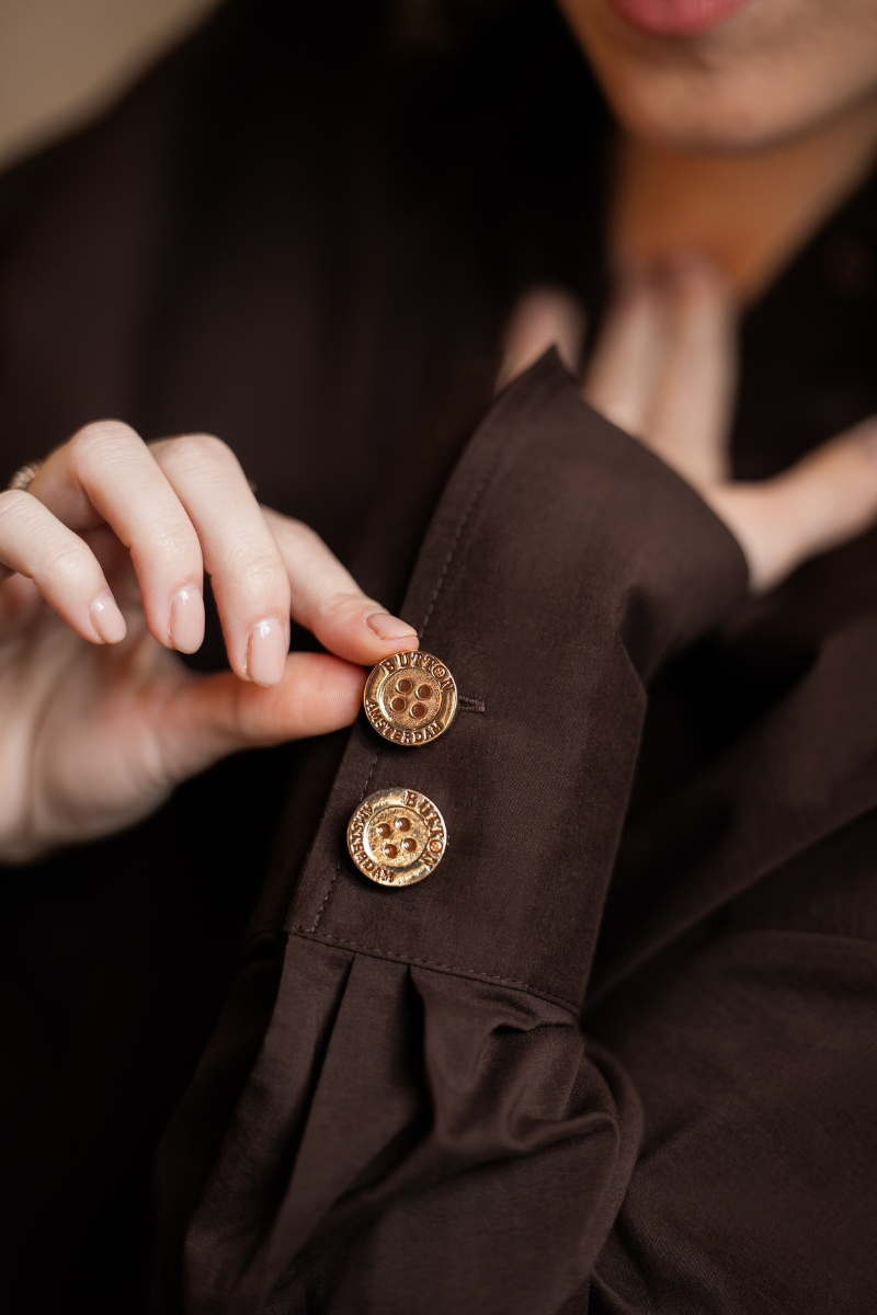 Each Button Amsterdam cover is a lightweight, clip-on accessory designed to sit neatly over your existing buttons. They are handmade in Amsterdam from high-quality, treated copper that is designed to resist tarnishing and keep its shine over time. The covers fit most standard blouse and shirt buttons up to approximately 11 mm and are made to feel comfortable for all-day wear. Every set is crafted to add a subtle, elegant detail without changing or damaging your garment.