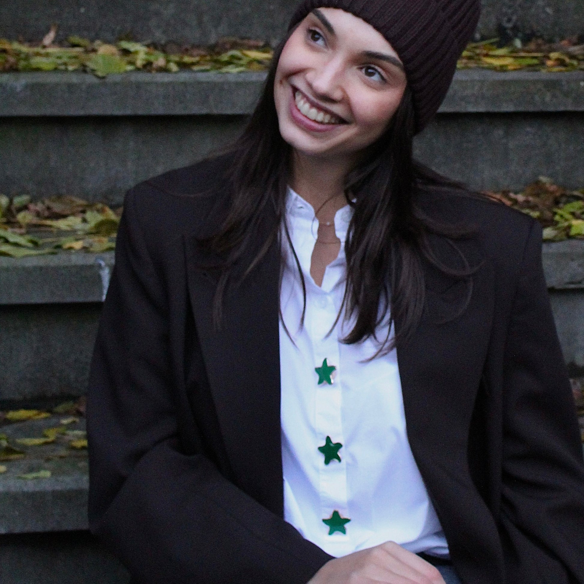 Each Button Amsterdam cover is a lightweight, clip-on accessory designed to sit neatly over your existing buttons. They are handmade in Amsterdam from high-quality, treated copper that is designed to resist tarnishing and keep its shine over time. The covers fit most standard blouse and shirt buttons up to approximately 11 mm and are made to feel comfortable for all-day wear. Every set is crafted to add a subtle, elegant detail without changing or damaging your garment.